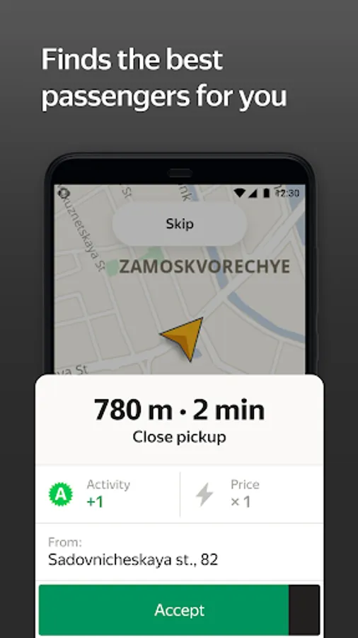 Find clients and get them to their destination quickly thanks to Yandex.Navigator. You don’t need to do anything – it will automatically get directions and guide you on your way. For you, Navigator is absolutely free.