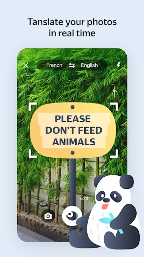 • Take a picture of a menu, road sign, book page or choose a photo with text from your Camera Roll to view its translation right over the image (only available when you are online). Visual text recognition currently works for 45 languages: Czech, English, French, German, Italian, Polish, Portuguese, Russian, Spanish, Turkish, Chinese, Ukrainian and others