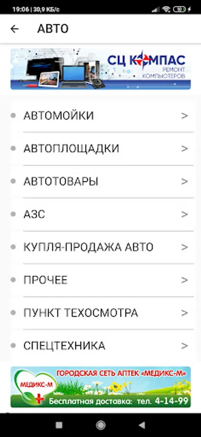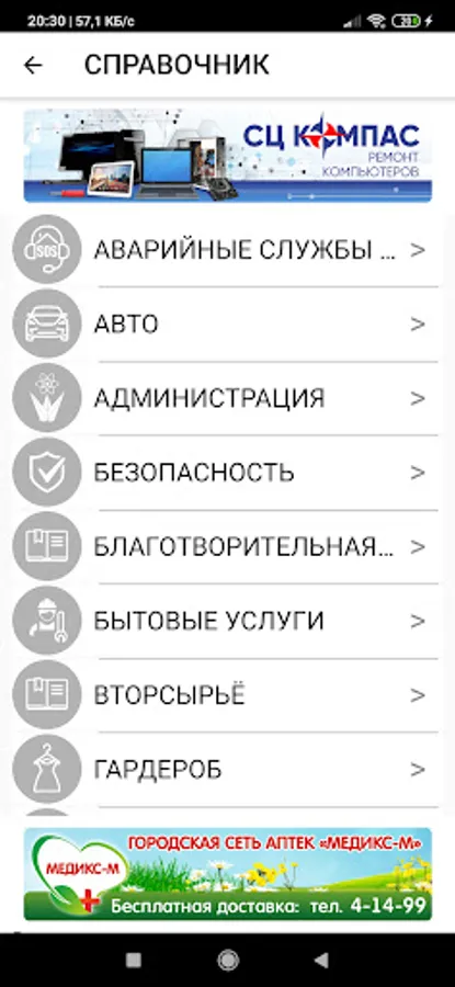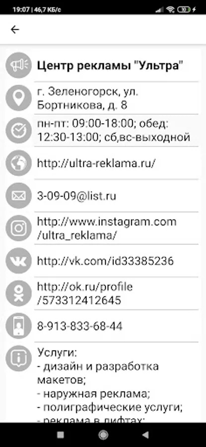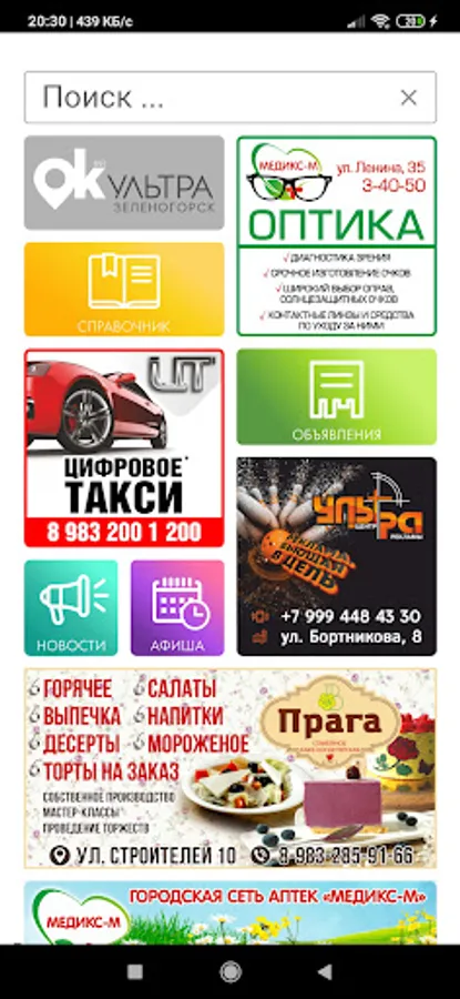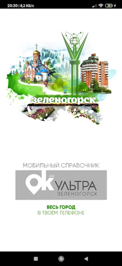 The application is a guide to organizations and services located in the city of Zelenogorsk