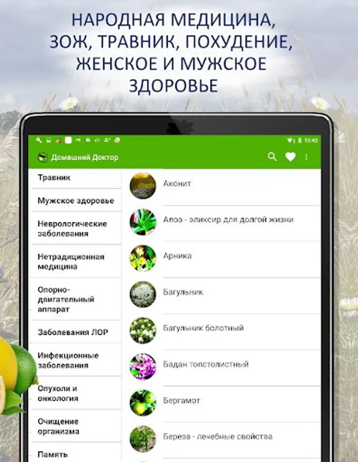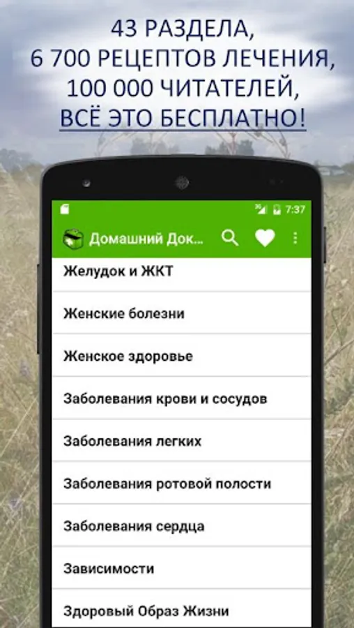 Home treatment of diseases in children and adults. 43 sections, more than a thousand articles and 6 thousand folk recipes. The list of diseases is sorted by category, searching for entries, bookmarking and working without the Internet, this makes the application an indispensable assistant.