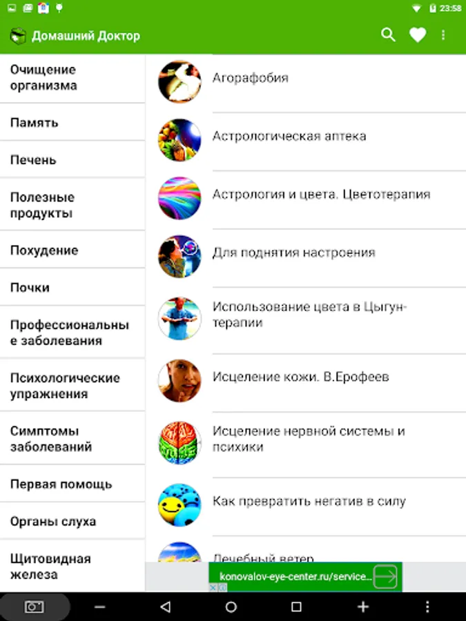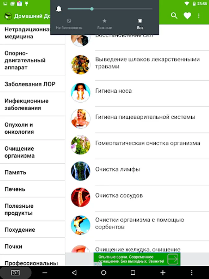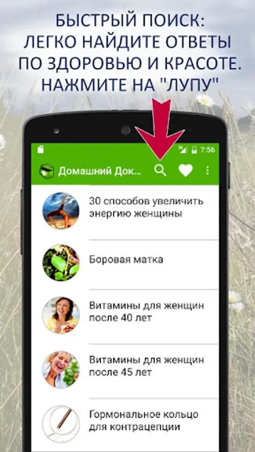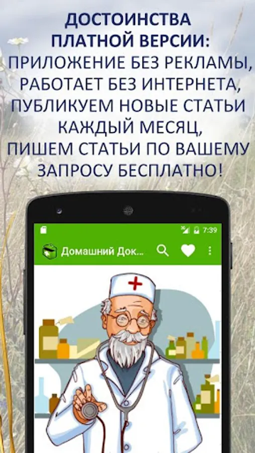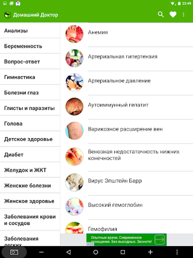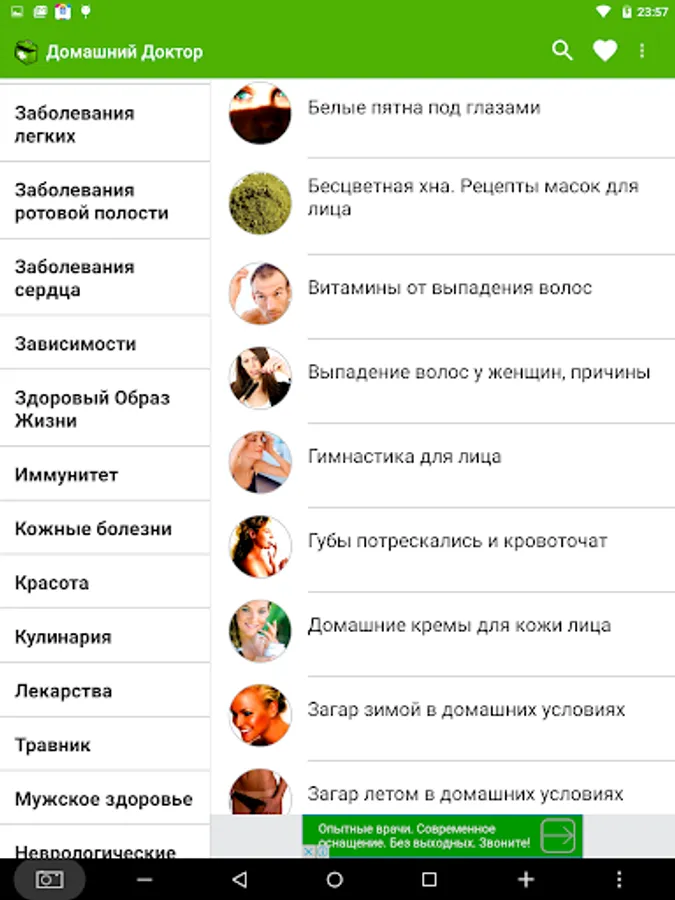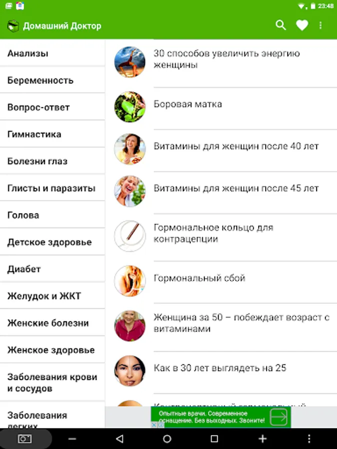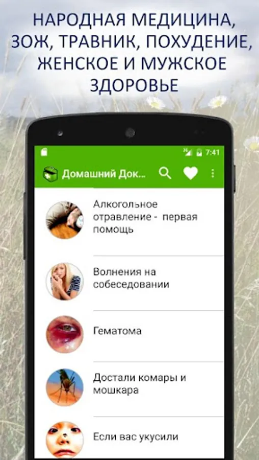 In the application you will find: a description of diseases, symptoms, signs, prevention, medications and treatments. Particular attention is paid to the sections: Women's and Men's Health, Beauty, Diets, Weight Loss, Healthy Cooking and Preservation, Body Cleansing and Healthy Lifestyle.