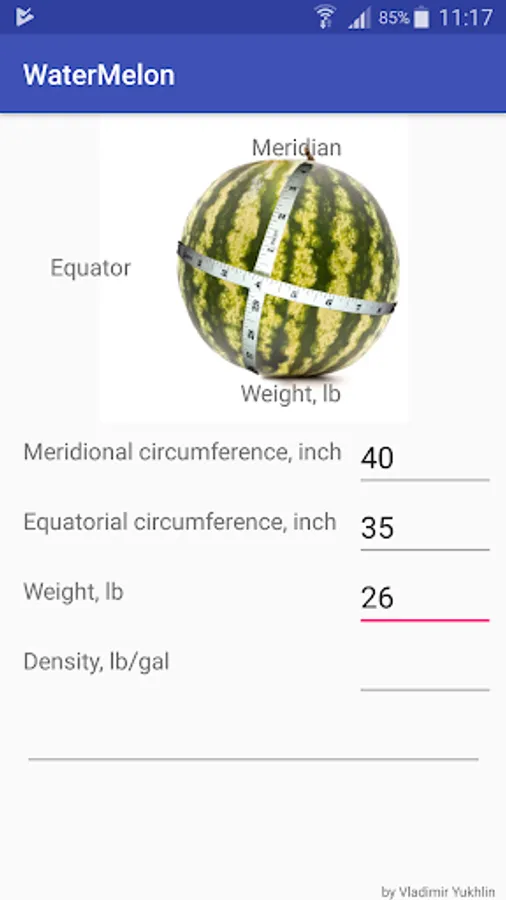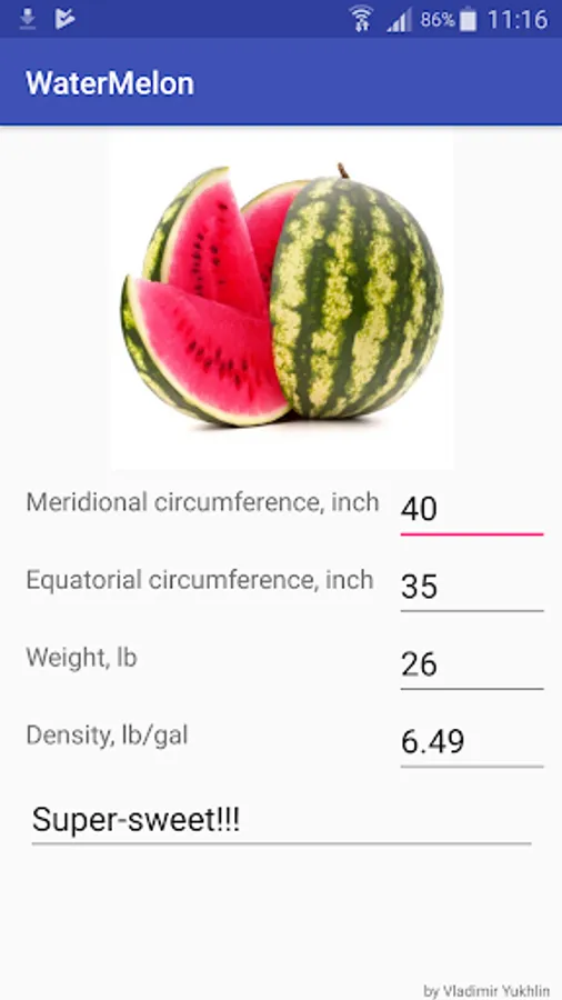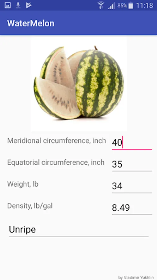 The application calculates the ripeness of watermelons. How to choose a ripe watermelon? Very simple. You go to the market, pick your favorite watermelon, weigh it, and measure two circumferences of the watermelon - front to back and at the middle. (The scale is usually available at the marketplace, just bring a measuring tape with you). The app will determine the density and ripeness of the watermelon that you picked! It's a shame to pay money and buy a green watermelon. With the help of the application you will make the right choice. Real sweetness is guaranteed!