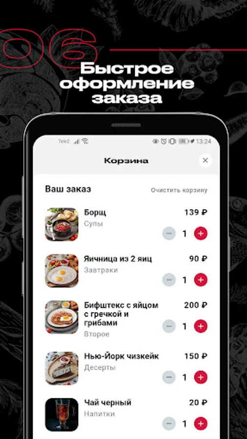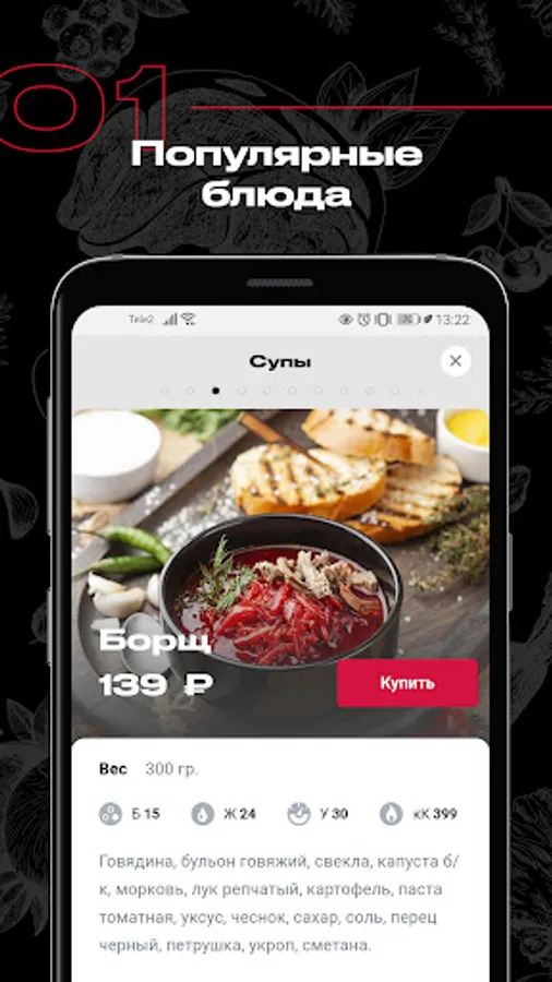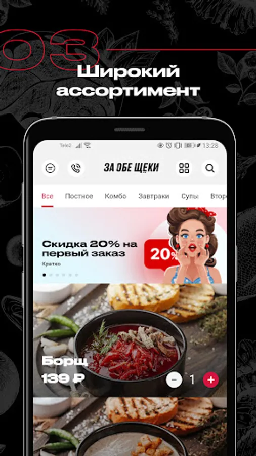 In For Both Cheeks, you can order lunch to the office, set a festive table or feed the whole family with a delicious dinner without wasting time on cooking and searching for recipes. Our chef and his team of professional chefs have developed a varied menu that is constantly being updated. And for your convenience, in the application, the entire menu is divided into categories: soups, breakfasts, snacks, salads, main course, side dishes, baked goods.