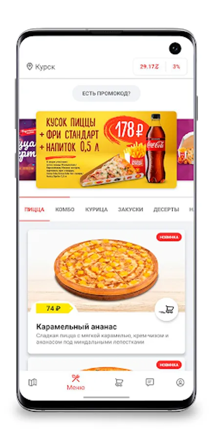 Making orders in the Zhar Pizza app is convenient and profitable. There is no more need to stand in line. In addition to the usual delivery, the application has the ability to order lunch online and receive an order in a cafe.