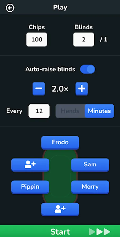 • Option to automatically raise blinds after a set amount of minutes or hands.