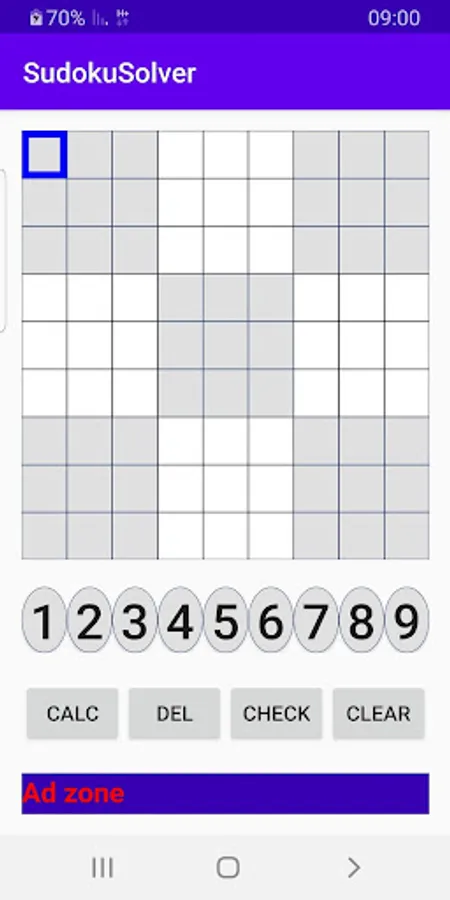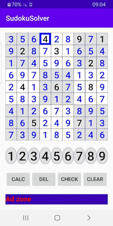 This application allows you to enter Sudoku 9X9 puzzle, edit the input by using DEL, and to use CALC to solve the puzzle.