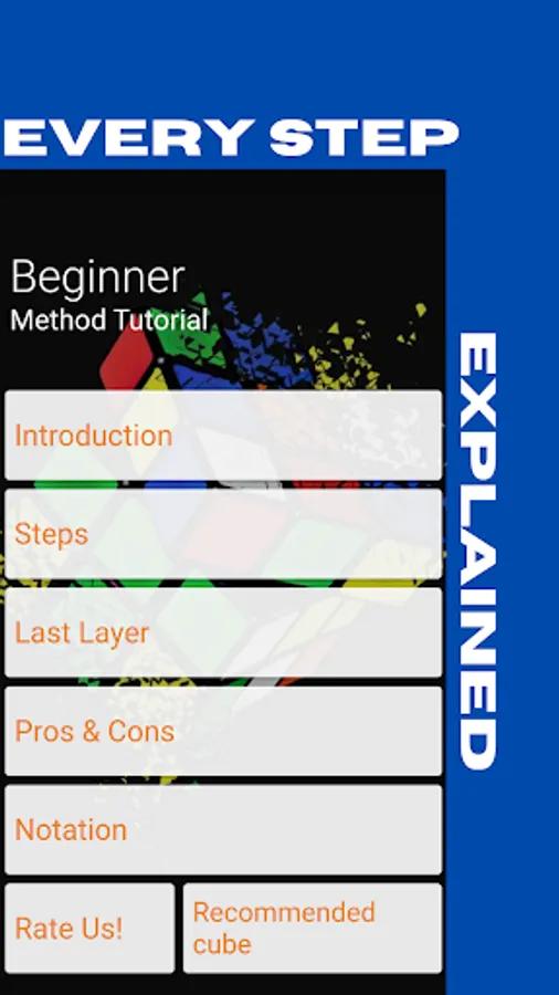 This Rubiks Cube Algorithms 3x3 app will guide you step by step dividing the resolution of the Rubik's Cube game for beginner in two parts: