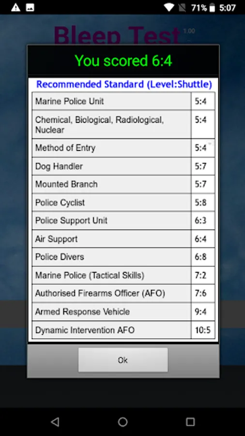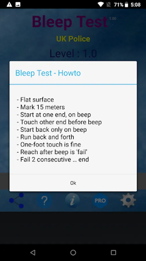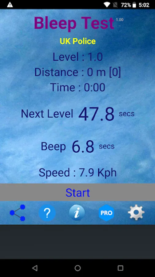 This app allows you to easily and confidently practice the Multi Stage Fitness Test (MSFT), aka Bleep Test, for police officer recruits as defined by the College of Policing. (For more information on the test, see https://www.college.police.uk/What-we-do/Standards/Fitness/Pages/default.aspx ).