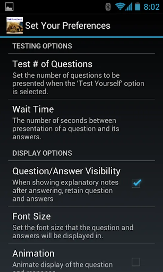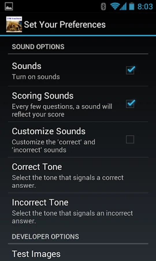 Test mode. Configurable number of questions, picked at random. Stores your score.