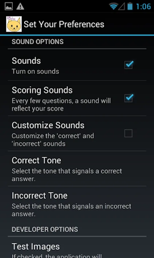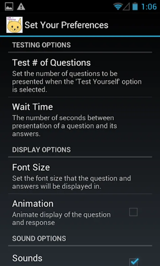 Test mode. Configurable number of questions, picked at random. Stores your score.