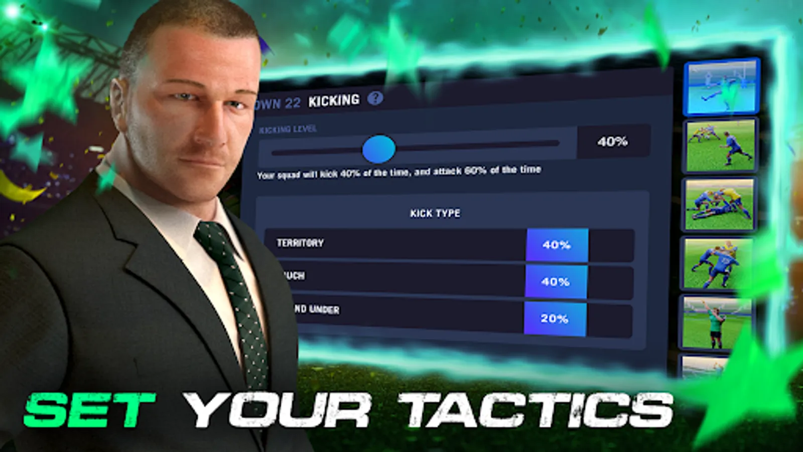 Watch your team play in our real-time 3D game engine. See your game plan come to life on the field to achieve victory!. Each game being different requires tactical thinking on how the manager can outsmart their opposition.