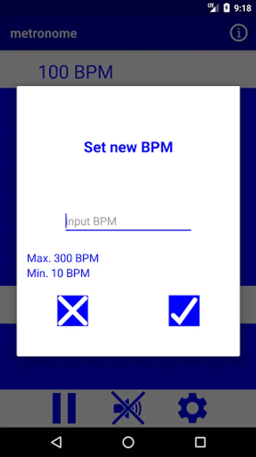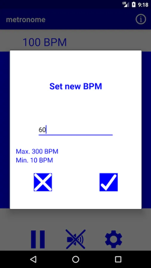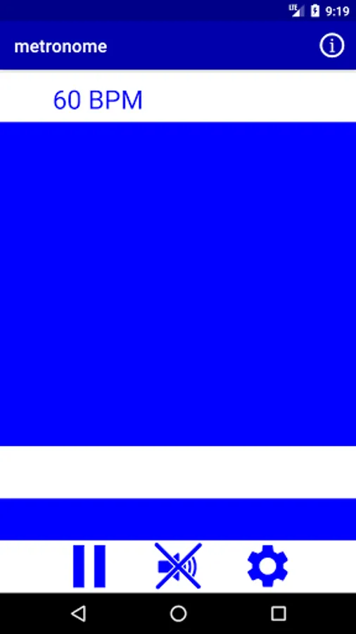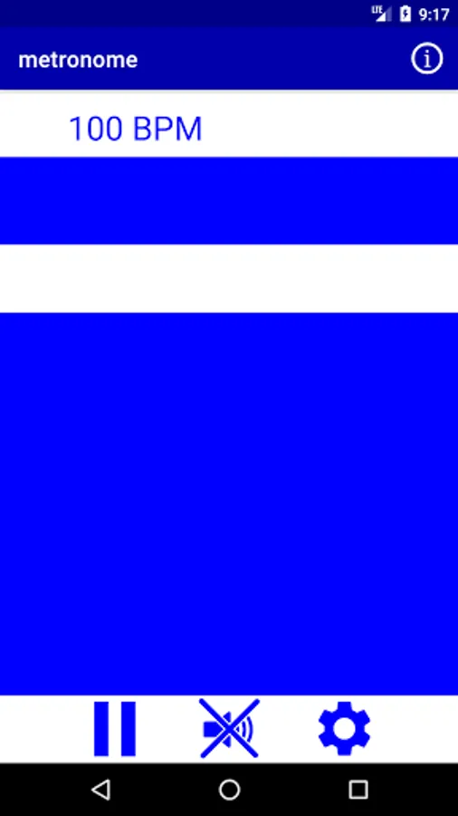 this metronome app is adjustable from 10 to 300 beats per minute BPM, you can pause it and stop the 'click' sound while the moving still bar shows the rhythm.