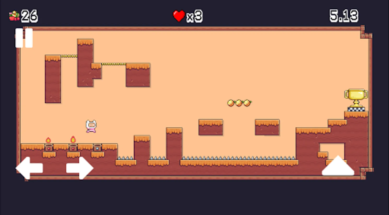 Run to the valley and collect fruits to show what you are capable of and set a new record. On the passage of each level give only 6 seconds! Jump over the abyss, do not fall on the spikes and do not stop, otherwise you may burn the flame.