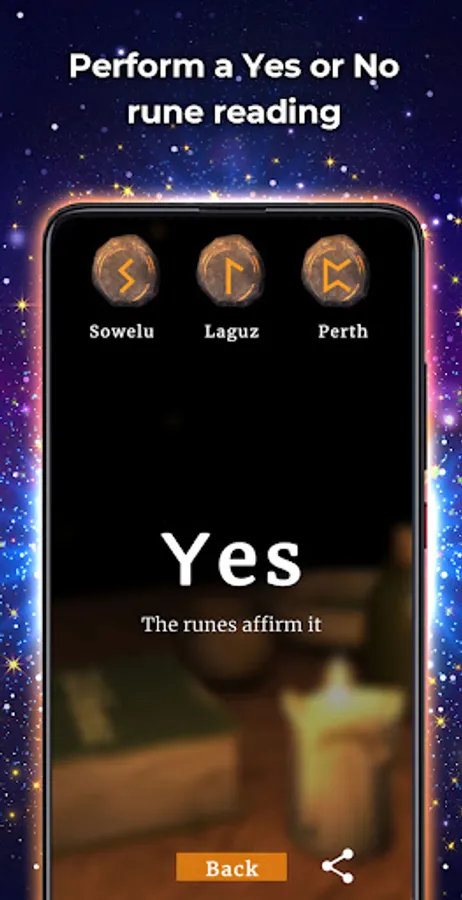 - Divination Yes or No: Ask a specific question and get a very concise answer according to the connotation of the runes.