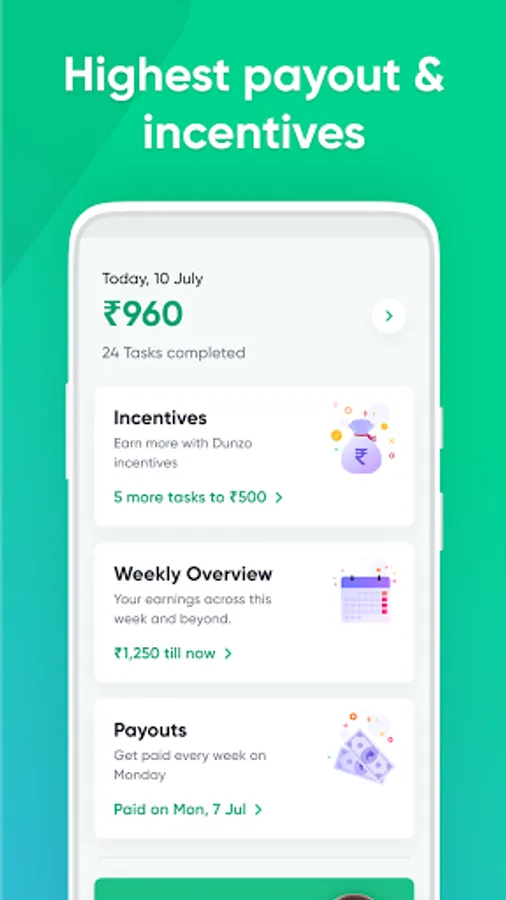 Our partner app is easy to use and will show you how much you have earned for each order you have completed. There is no need to go to the Dunzo partner office and deposit the collected or pending cash, you can directly transfer it to Dunzo through UPI without any hassle. Apart from payout and incentives, Dunzo Delivery Partner will also receive a joining bonus and earn extra by referring your friends to Dunzo.