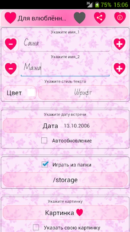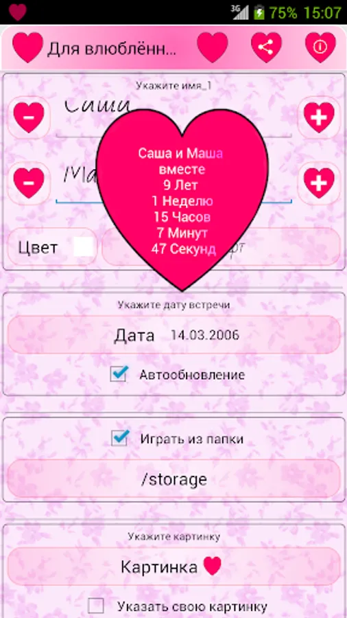 the lower half - Display time (years, months, weeks, days, hours, minutes, seconds), during which you together, and playback tunes. To stop playing music again, click on the lower half of a heart.