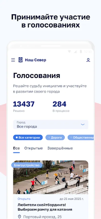 After completing a short registration, you can take part in open voting or report a problem in your city, helping us to develop, monitor and timely eliminate deficiencies in the state of infrastructure, roadway, lighting, cleaning of the territory and other issues.