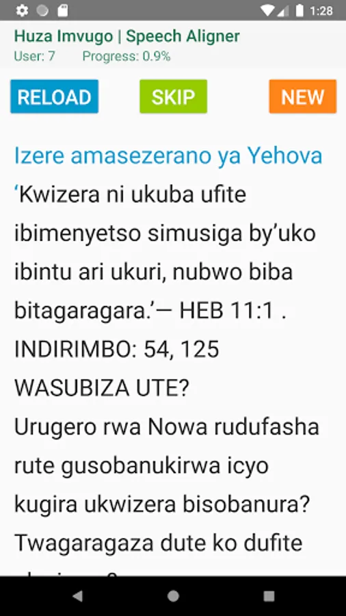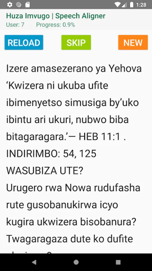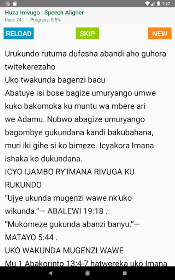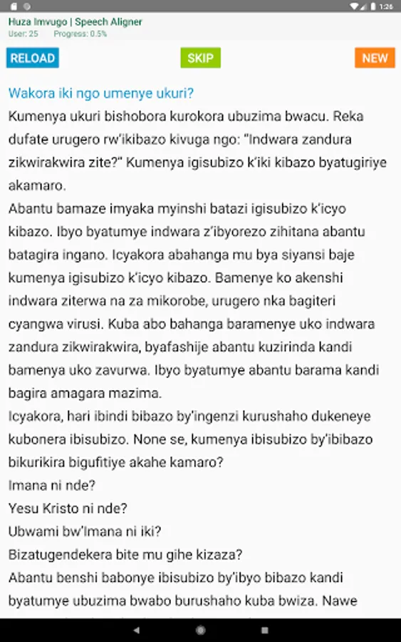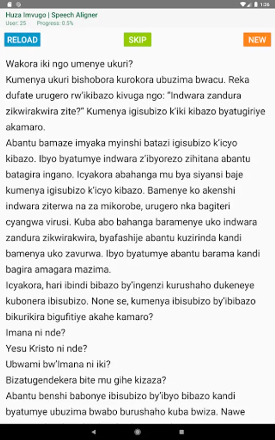 With the goal of developing language technology for Kinyarwanda, we are asking Kinyarwanda speaking volunteers to contribute data though Huza Imvugo App. The App plays an audio clip with corresponding text shown, and the user is asked to touch/click the last spoken word in the text at every pause. Aligning phrases with speech data will help us develop better acoustic and pronunciation models for Kinyarwanda.