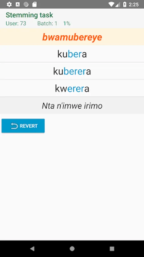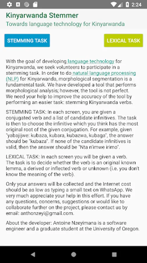 With the goal of developing language technology for Kinyarwanda, we seek volunteers to participate in a stemming task. In order to do natural language processing (NLP) for Kinyarwanda, morphological segmentation is a fundamental task. We have developed a tool that performs morphological analysis; however, the tool is not perfect. We need your help to improve the accuracy of the tool by performing an easier task: stemming Kinyarwanda verbs.