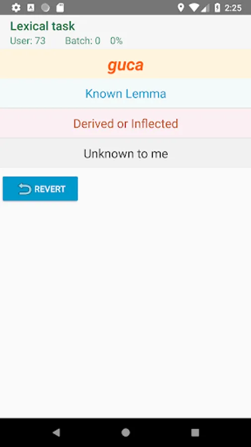 LEXICAL TASK: In each screen you will be given a verb. The task is to decide whether the verb is an original known lemma, a derived or inflected verb or unknown (i.e. you don't know the meaning of the verb).
