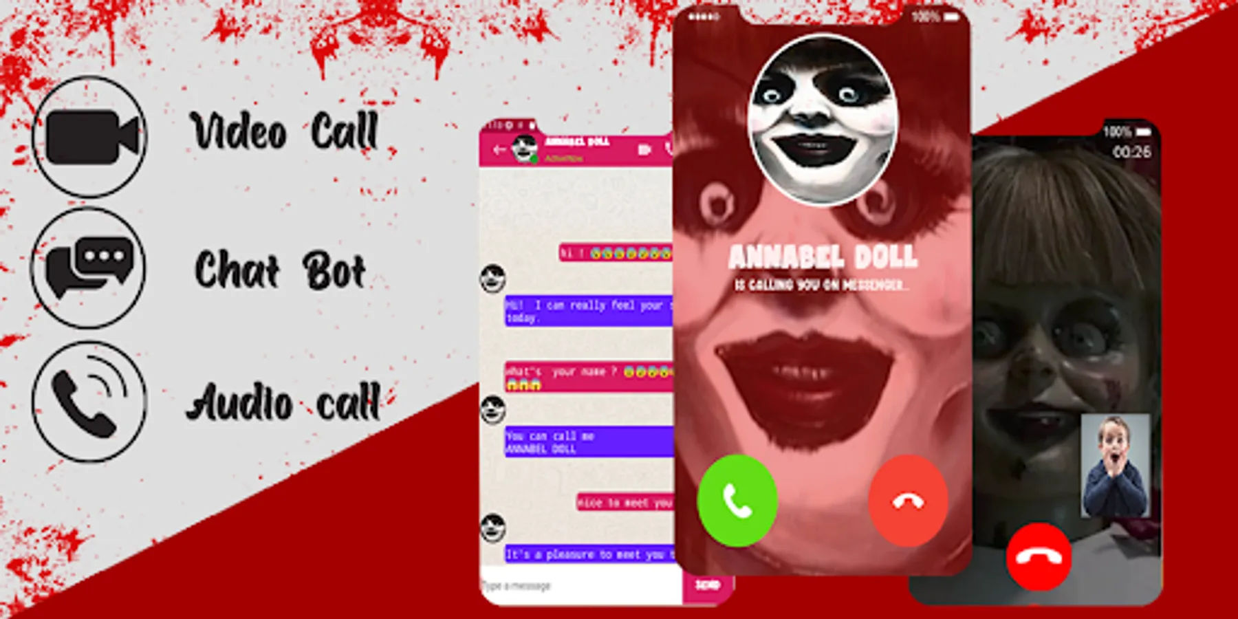 This app allows you to set incoming fake call, fake video call and a chat simulation with the scary annabel Doll it is a dial app that simulate receiving calls and video calls from the creepy Annabel Doll and also have a long chat with him, it can easily be used to prank friends or family members and watch their surprised faces when they receive the horrific call, it my also have many other features as you will find below