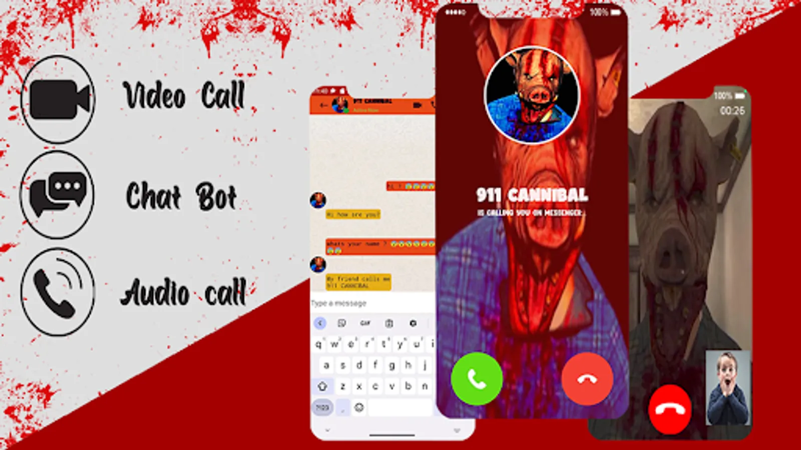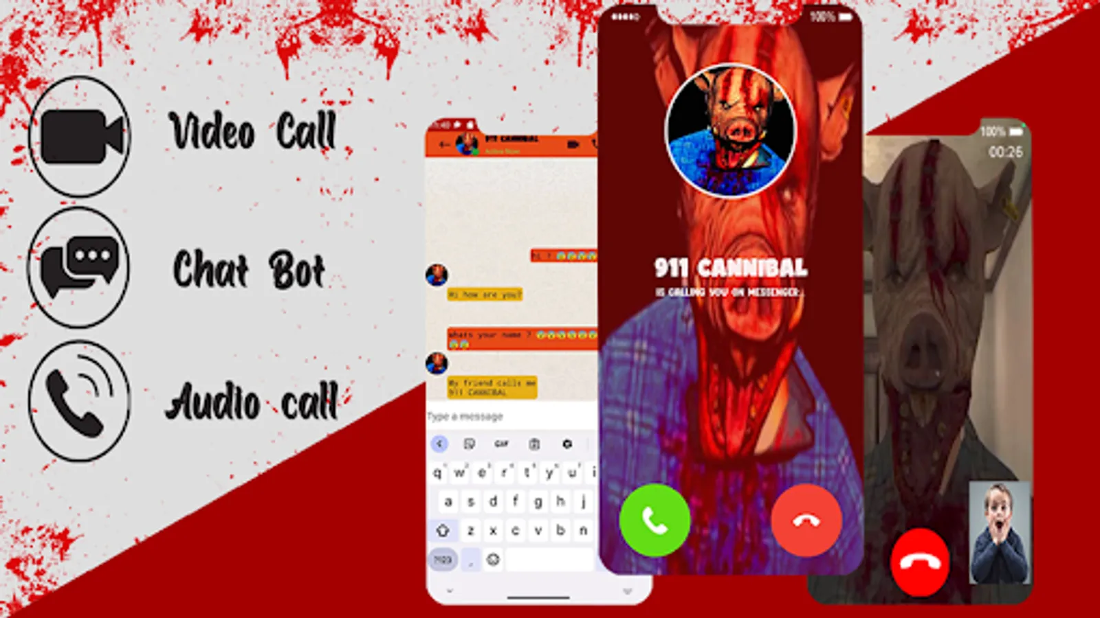 This app allows you to set incoming fake call, fake video call and a chat simulation talking 911 cannibal it is a dial app that simulate receiving calls and video calls from the creepy 911 cannibal and also have a long chat with him, it can easily be used to prank friends or family members and watch their surprised faces when they receive the horrific call, it my also have many other features as you will find below