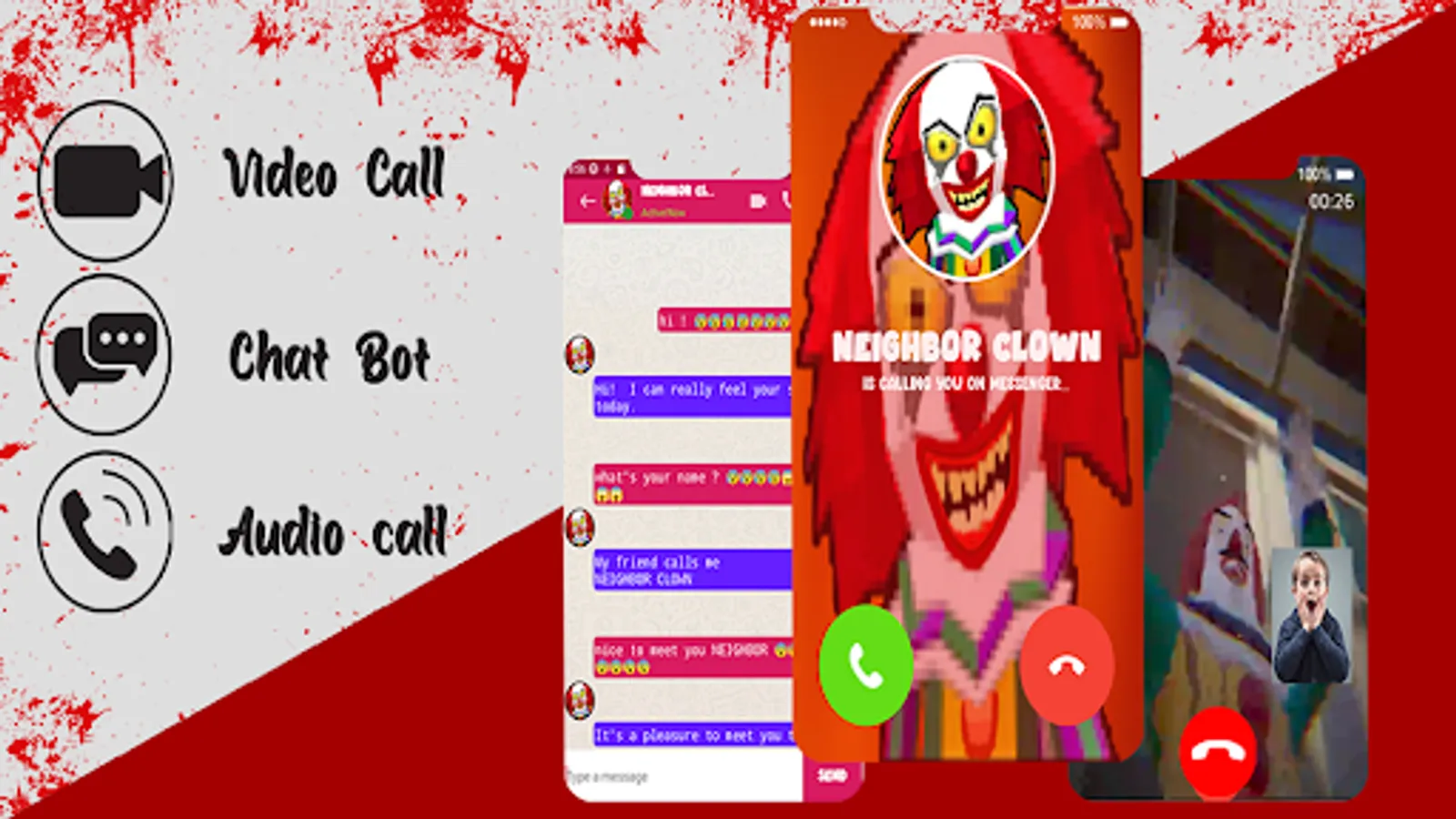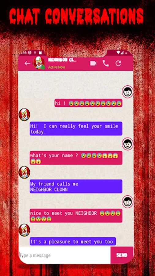 This app allows you to set incoming fake call, fake video call and a chat simulation with the Scary neighbor Clown it is a dial app that simulate receiving calls and video calls from the creepy neighbor Clown and also have a long chat with him, it can easily be used to prank friends or family members and watch their surprised faces when they receive the horrific call, it my also have many other features as you will find below this dial app will allow you to use your phone in order to prank your friends because it gives a simulation of talking and chatting with the sweet and funny scary neighbor Clown. thanks to this app you won't get bored easily and you will have the possibility to receive lots of calls and chat messages.
