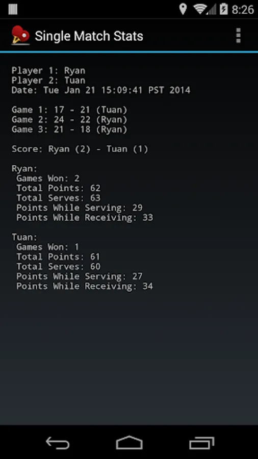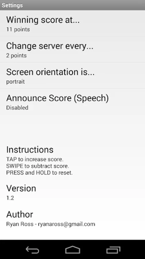 Table Tennis Score Keeper is a Table Tennis/Ping Pong score keeper application. In addition to the score, it will also track the current Server and randomly choose one at the beginning of each game. Voice announcing of score is now an option as well as a Saved Matches database and history.