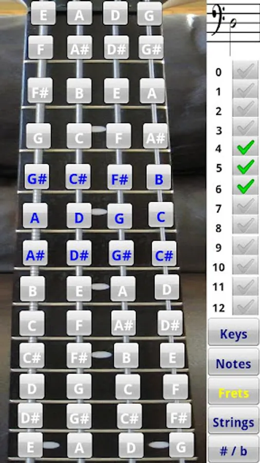 Touch the notes to practice the first 12 frets on the fretboard. Use the Notes preset to highlight notes you would like to focus on.