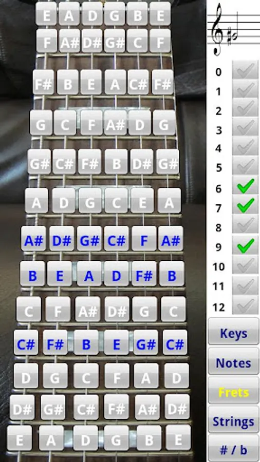 Touch the notes to practice the first 12 frets on the fretboard. Use the Notes preset to highlight notes you would like to focus on.