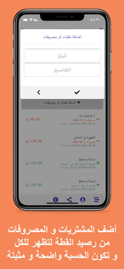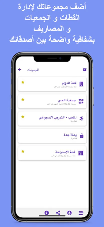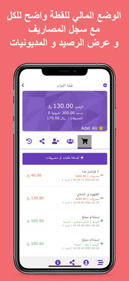 - A screen for recording and displaying expenses and purchases with details showing its data for all members of the group and controlling it by the supervisor and the owner of the star