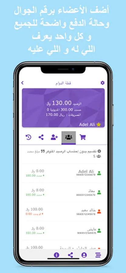 - Screen displaying the group members with displaying the required amount for each member or the amount due to him in case he pays more than the specified cat