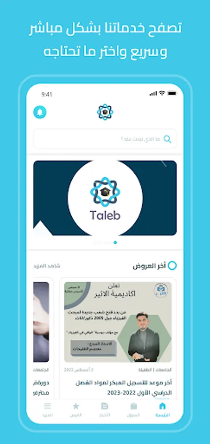 A platform provides a smooth learning environment for students, institutions, universities, and educational centers, where the student can search, inquire, and benefit from educational resources that are published through the Taleb platform.