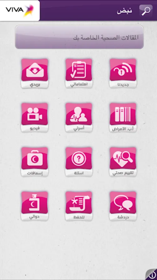 يأتيك تطبيق "صحتك مع نبض" بمحتوى توعوي ووقائي ذي مرجعية طبية عالمية موثوقة، معرّب ومبسّط. يتضمّن هذا التطبيق: