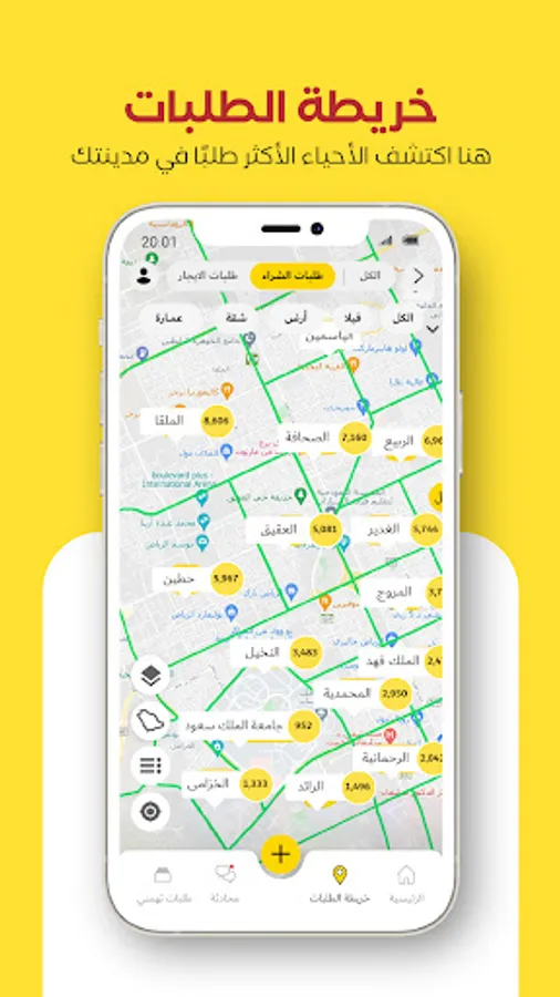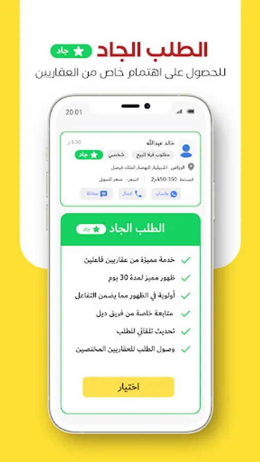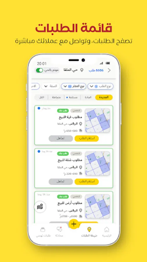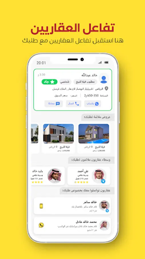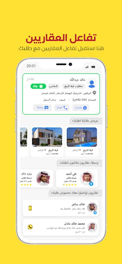 Now, thousands of real estate brokers interested in your requests are waiting for you and are ready to provide real estate offers that suit you according to the specifications of your request, whether for rent or sale, through instant communication (direct chat within the application, phone call, or WhatsApp).