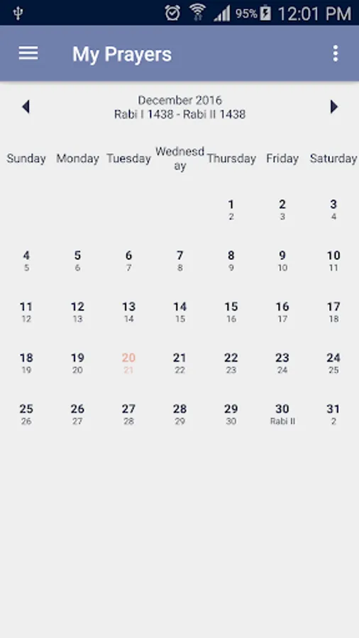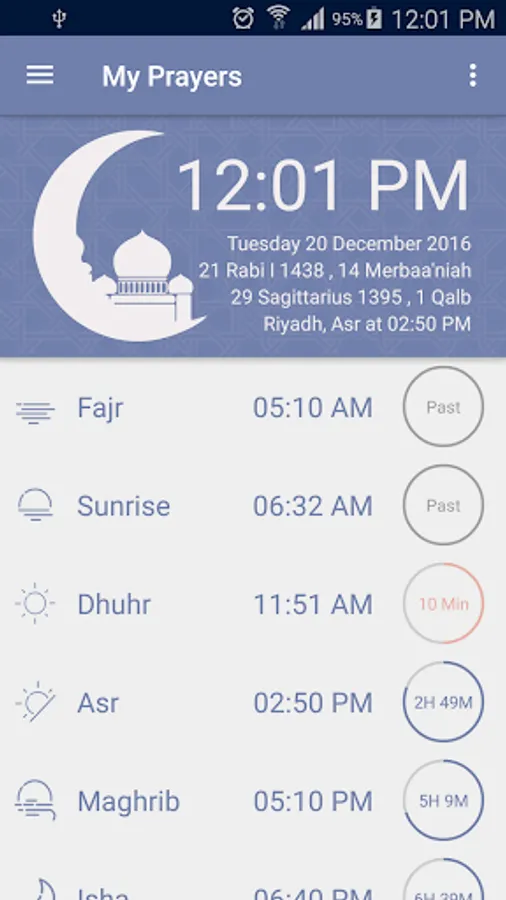 Check the Islamic prayer times for today, future and past dates. With the location-based you can check the prayer times at any place you are! MyPrayers application contains an easy way to convert between Gregorian and Hijri dates.