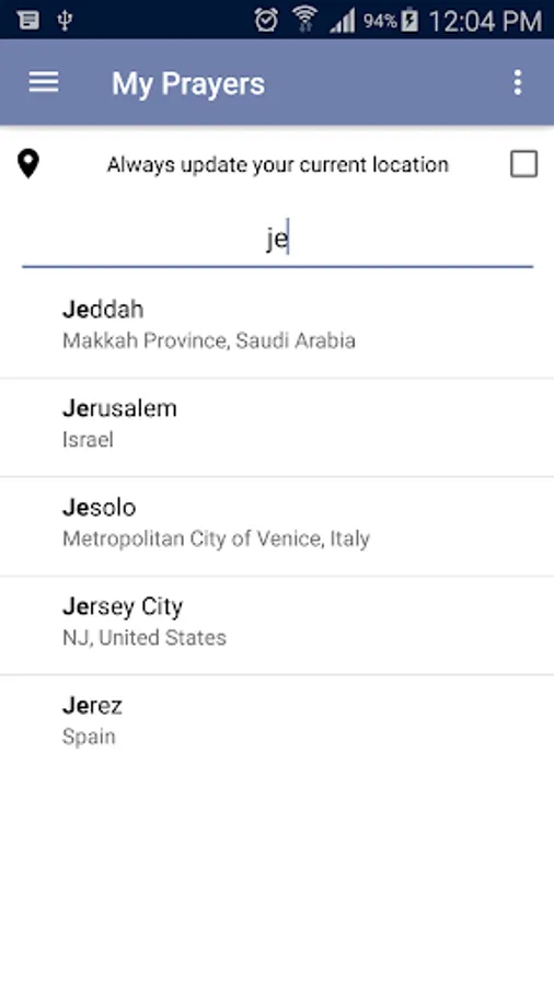Note: to show correct prayers time while using "Search for City", the time zone setting on the device should be modified according to the new searched city.