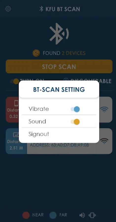 The application searches for devices that use Bluetooth technology during exams. When the mobile is picked up, the Bluetooth signal emits sound or vibration according to your settings. The application shows the signal strength of the devices around it in the same location and determines whether the other device is near or far, When the name of the device appears red, it means that it is in a nearby range and it is transferring data. Yellow means Bluetooth is only available in the device but does not transmit data.