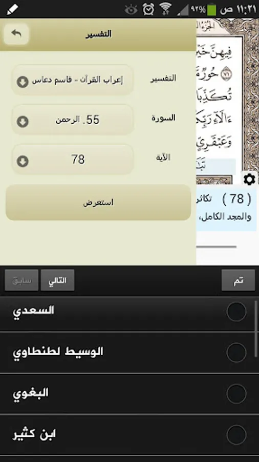 Six Arabic Tafsir(Commentary) "Al-Saa'di, Ibn-Katheer, Al-Baghawy, Al-Qortoby, Al-Tabary and Al-Waseet".