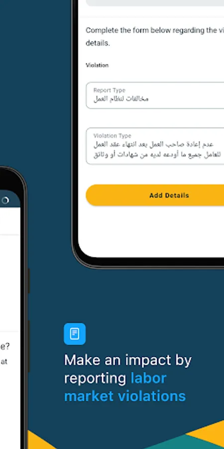 The app provides a number of services to individuals, such as regulations and procedures for labor, civil service, and social development. As an active member of society you can contribute by reporting labor market violations or helping to report those in need so that we can reach and support them.