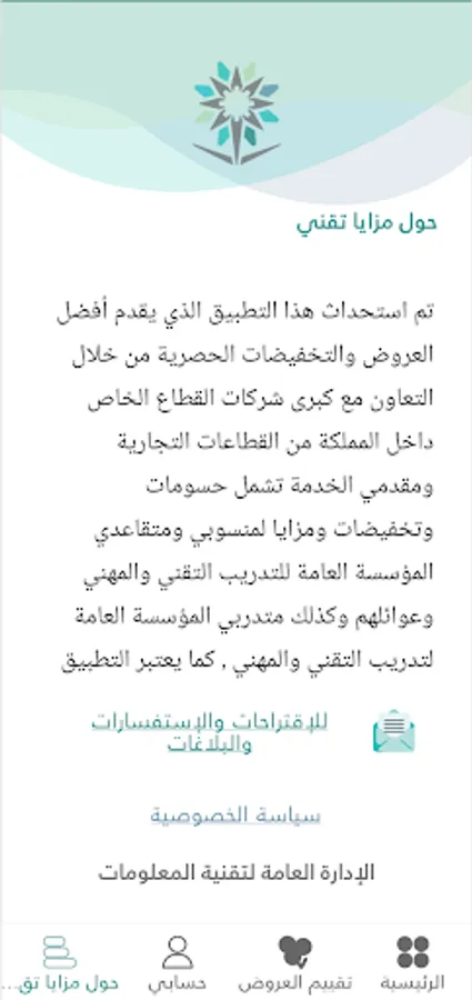 This application has been developed that provides the best offers and exclusive discounts through cooperation with major private sector companies in the Kingdom from the commercial sectors and service providers that include discounts, discounts and benefits for employees and retirees of the General Organization for Technical and Vocational Training and their families as well as trainees of the General Organization for Technical and Vocational Training, and the application is considered one of the initiatives Social responsibility that seeks to create preferential treatment and quality service for the employees and retirees of the General Organization for Technical and Vocational Training and their families in addition to the trainees by building a system of strategic partnerships with commercial and service entities to obtain the best offers and services, believing in the role of the training institution in the advancement and advancement of society by creating an appropriate educational and motivational environment To raise the morale of the aforementioned groups, to enable them to innovate and excel, and to enhance their educational and training roles.