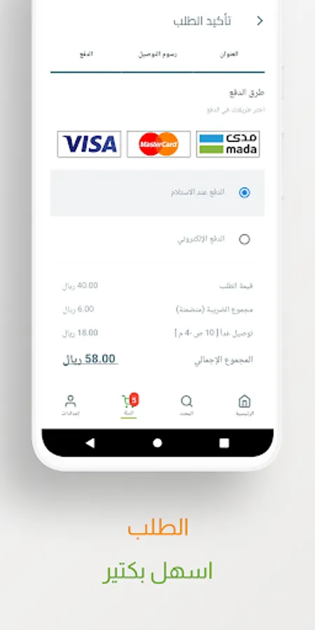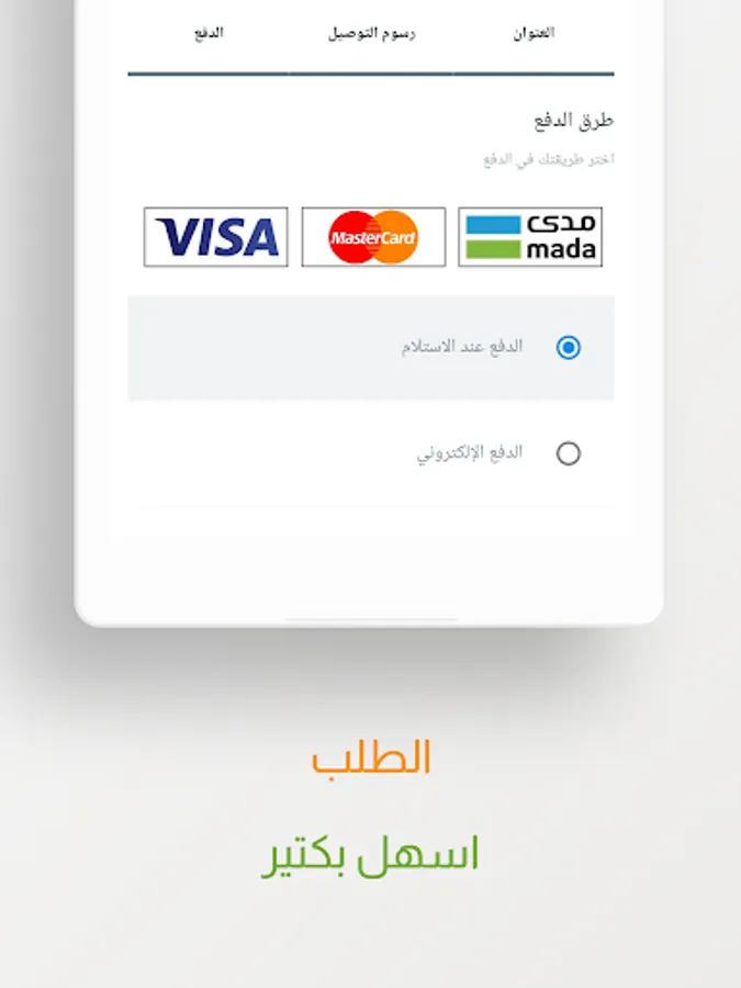 - The application provides easy and convenient payment methods for everyone: Cash, credit card, as well as through MADA upon receiving your items