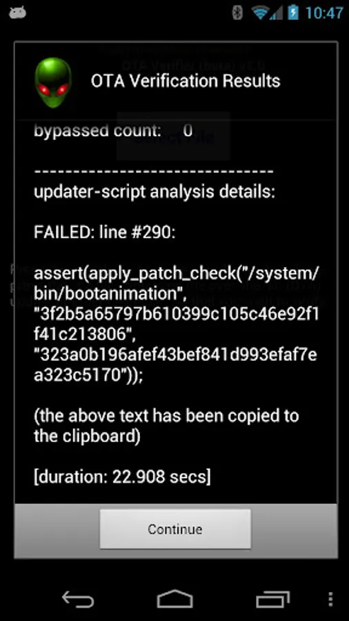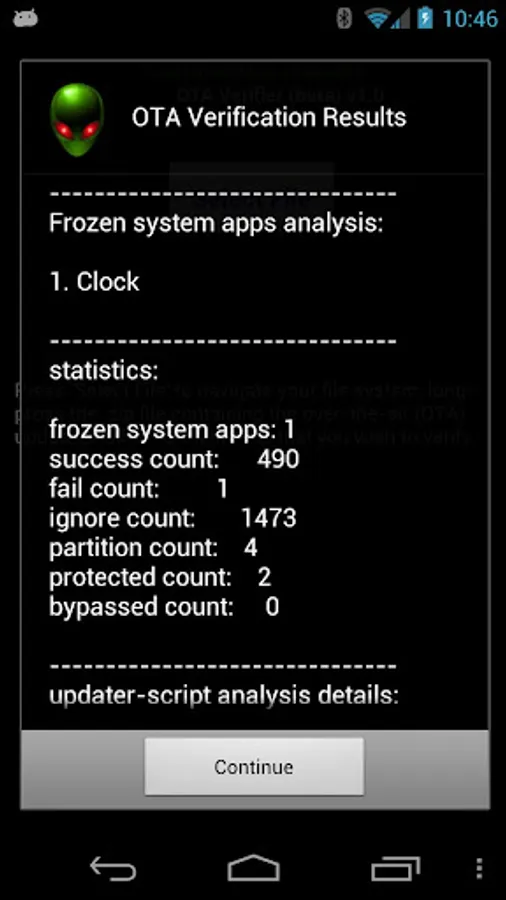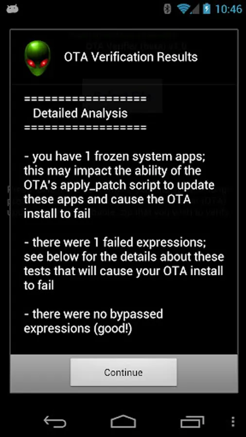 1. Savvy root users probably already know that after a failed .zip file installation, you should be able to view the /cache/recovery/last_log file to view the information about what might have failed. OTA Verifier will try to uncover all of the issues and not just the first one that causes the installation to fail.