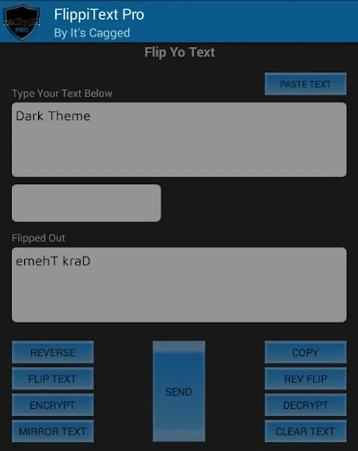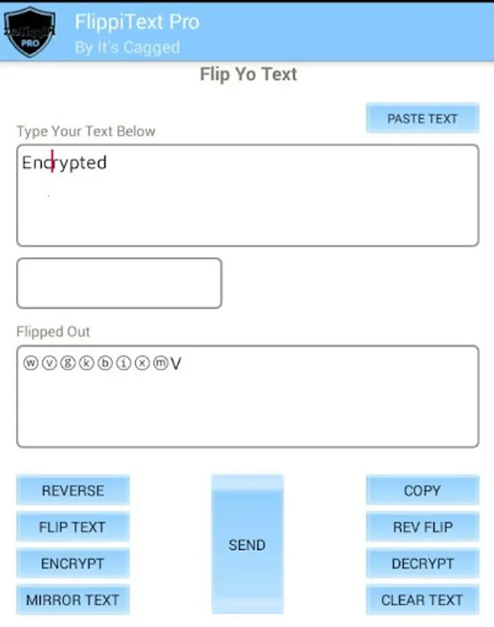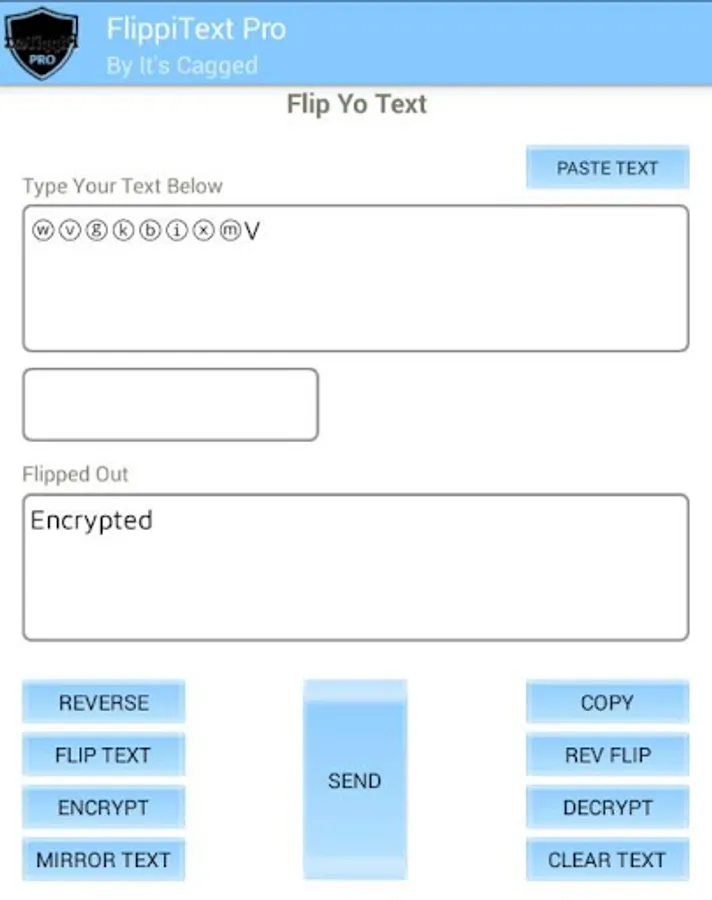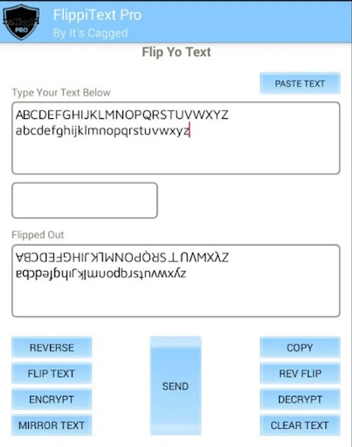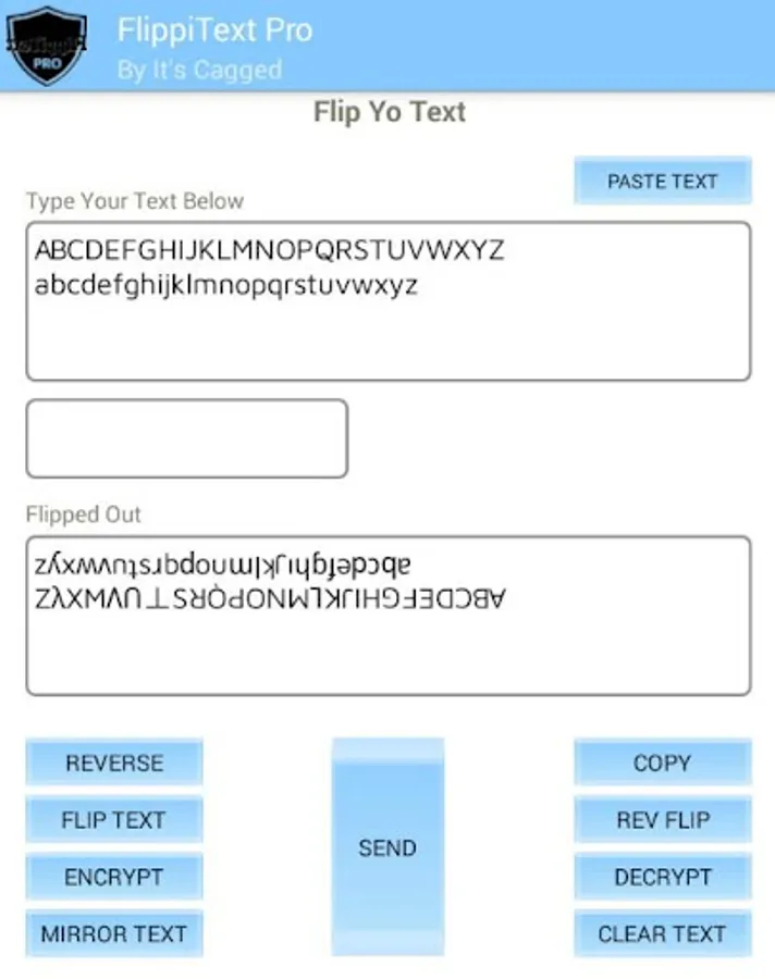 FlippiText Pro will allow you to send messages that are flipped, reversed,encrypted,decrypted,upside down,back to front text and mirror text. The receiver will be able to decrypt text sent to them by FlippiText Pro. This application does not collect any text being used within it. All text are available on your device only and is not shared with any other clients. You do not need network connection to use FlippiText.