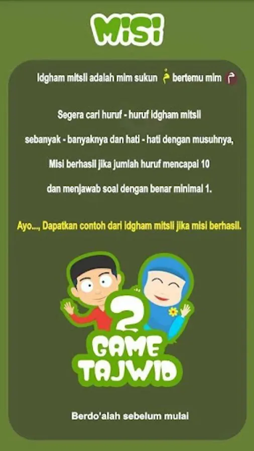 Game Tajwid 2 (Adventure) is a game to learn the science of Tajweed (ordinances to read Al-Quran). This game is the sequel to the game tajwid invited to explore legal Mim breadfruit. Is provided so that children - children or who are just learning about the science of recitation could easily while playing.