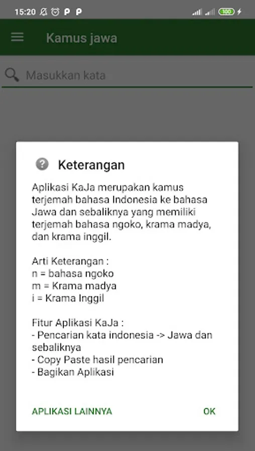 Kaja application is a dictionary of Indonesian translation into Javanese and vice versa. Javanese languages supported are ngoko, middle manners, and manners.