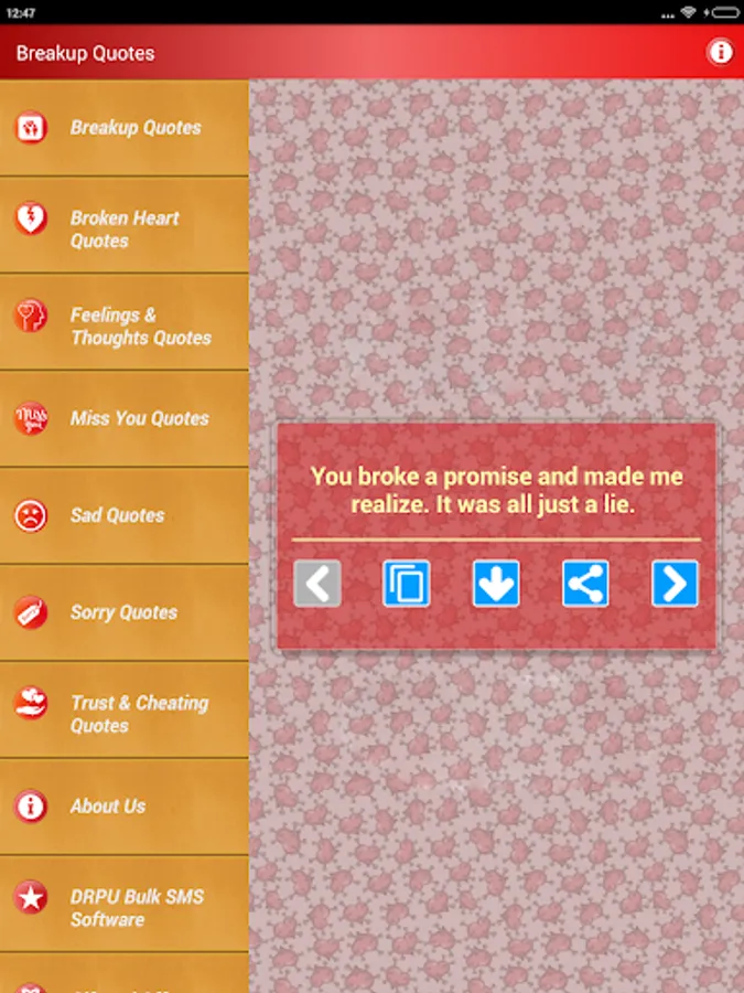 We have compiled a lot of Sorry messages and status that can help you with Love break up and patch ups and Fixing things in life and living happily above after. App also contains notes about lighter side of life and allows you to share Funny Girlfriend boyfriend Trust and Relationships Breakup and Recovery sayings. If you are feeling Lonely and Hurt on losing a Friend or love, you have a number of Inspirational Miss You status and Broken Feelings one-liners and picture Quotes