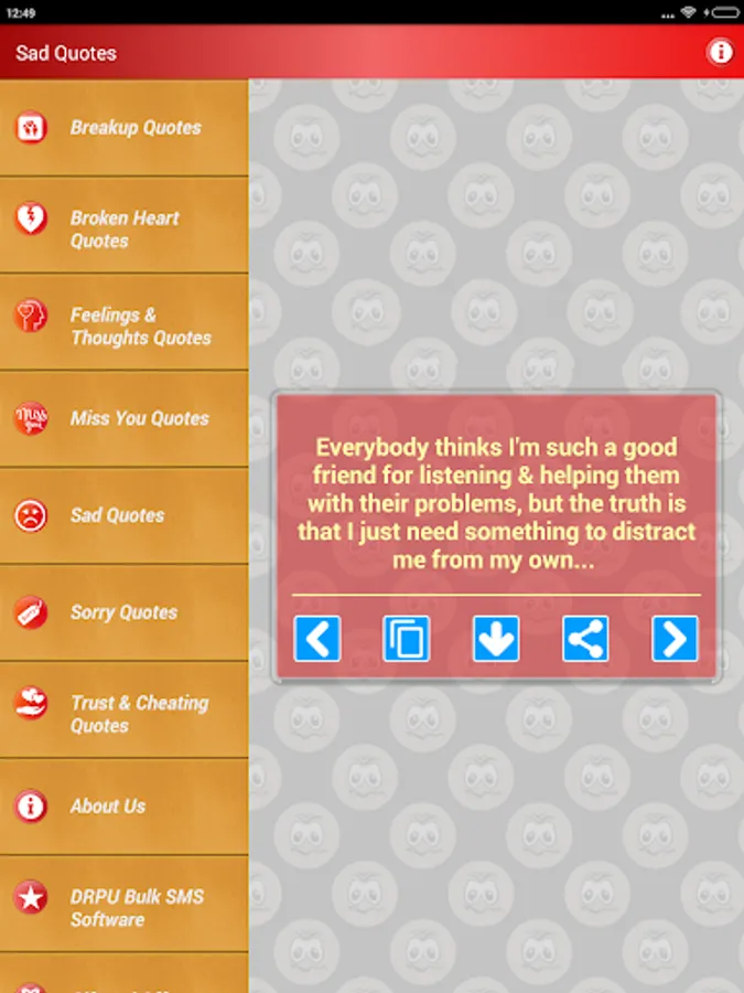Sad & Broken Heart Status is a Free App of Feeling Lonely Quotes inspirational collection about Sadness Feelings after Losing a Friend after love break up to help you find comfort when all you feel is pain through times of sorrow and unhappiness. There is nothing worse than being in love or friendship alone. Share broken heart quotes, sad love saying and express yourself.