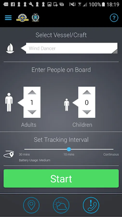 For filing a planned trip choose your vessel, determine the end destination, calculate the ETA (Estimated Time of Arrival), enter the number of persons on board and the activity type. Then, using the built-in maps, select a starting point, an optional waypoint and the end destination. Once this is completed simply press the ‘start’ button when you are ready to start your trip.