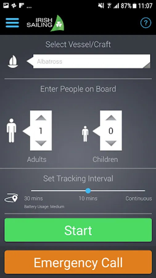 Pressing ‘set sail’ will register the journey details with the Irish Sailing Association computer server and will activate position reporting in the App. At regular intervals the App will send a position report to the server and your emergency contacts will be automatically alerted 30 minutes after the journey exceeds the ETA. At any stage during the journey you can end your trip, revise the ETA, number of people on board or the destination.